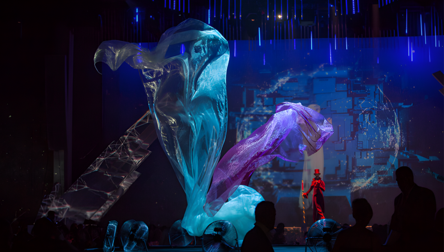 C’est un spectacle incarné, interprété par des artistes en scène, où les corps, les voix et la musique sont au coeur de l’expérience. La vidéo, la lumière et la technologie ne sont jamais autonomes : elles dialoguent avec le vivant, prolongent le geste, amplifient l’émotion.