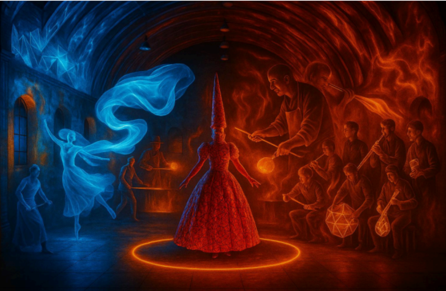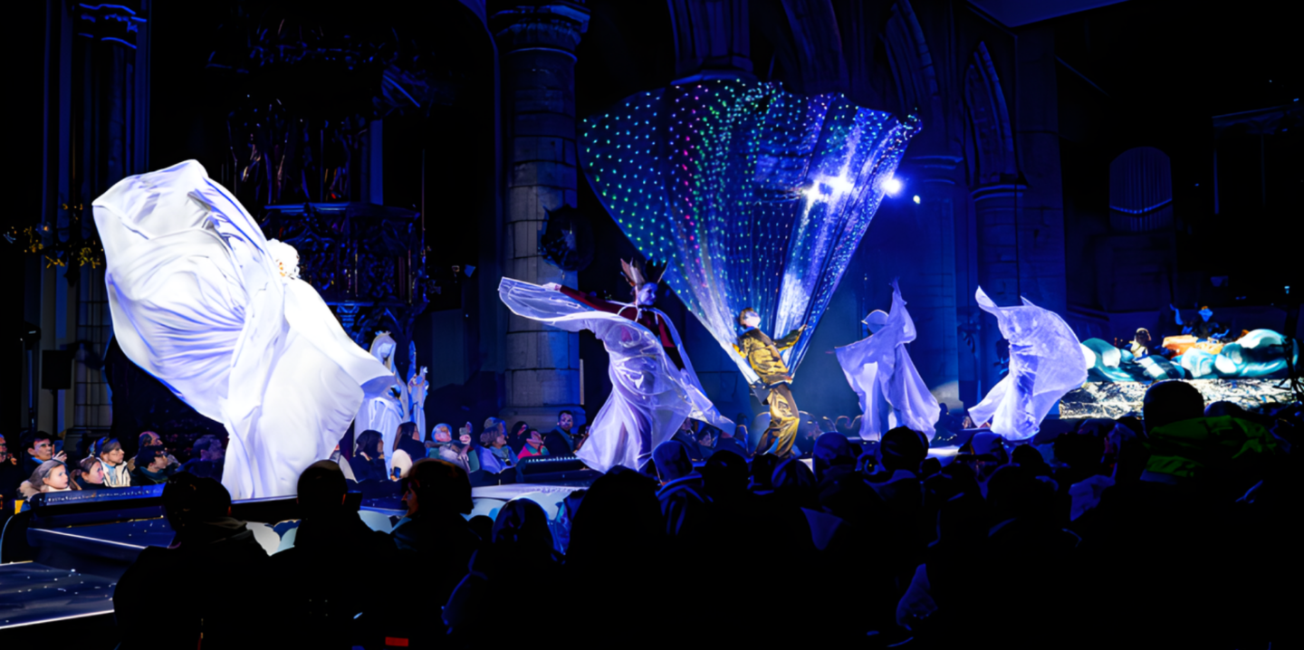 Dans cet univers, le feu, le cristal, la transparence et le reflet deviennent des matières scéniques. Les artistes évoluent au sol et dans les airs, traversent les faisceaux lumineux, surgissent des hauteurs ou disparaissent dans la pénombre, comme attirés par l’éclat du cristal. Les projections vidéo monumentales épousent l’architecture de l’abbaye, non comme décor figé, mais comme une matière vivante au service de la dramaturgie.