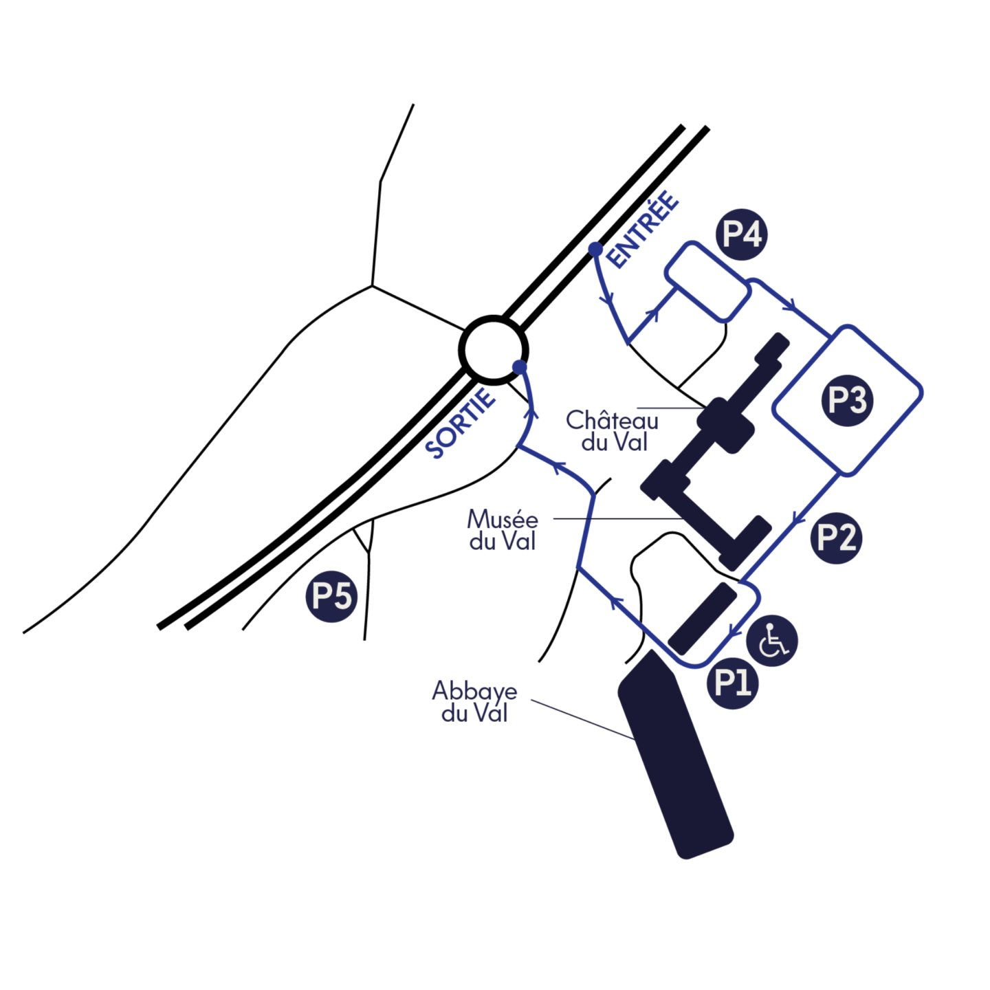 Le parking P1 est le parking recommandé pour les visiteurs à mobilité réduite, car il se situe au plus près des accès principaux.